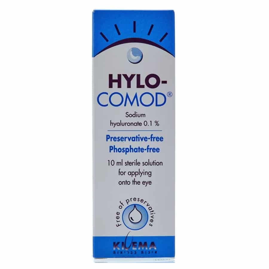 טיפות העיניים הילו קומוד (Hylo Comod 10ml) הינם דמעות מלאכותיות / טיפות הרטבה סטריליות לשטיפה וסיכוך של עדשות מגע, בתוך העין ומחוצה לה, לשיפור ההידרציה של משטח העין. טיפות אלו גם מיועדות לשימוש במקרים של התערבויות ניתוחיות בעיניים, ומיועדת להקלה על אדמומיות וגירויים בעיניים. כל בקבוק מכיל 10 מ”ל (בערך 300 טיפות בודדות) ללא פוספטים וללא חומרים משמרים. טיפות הרטבה אלה מיועדות לשימוש עם כל סוגי עדשות המגע.