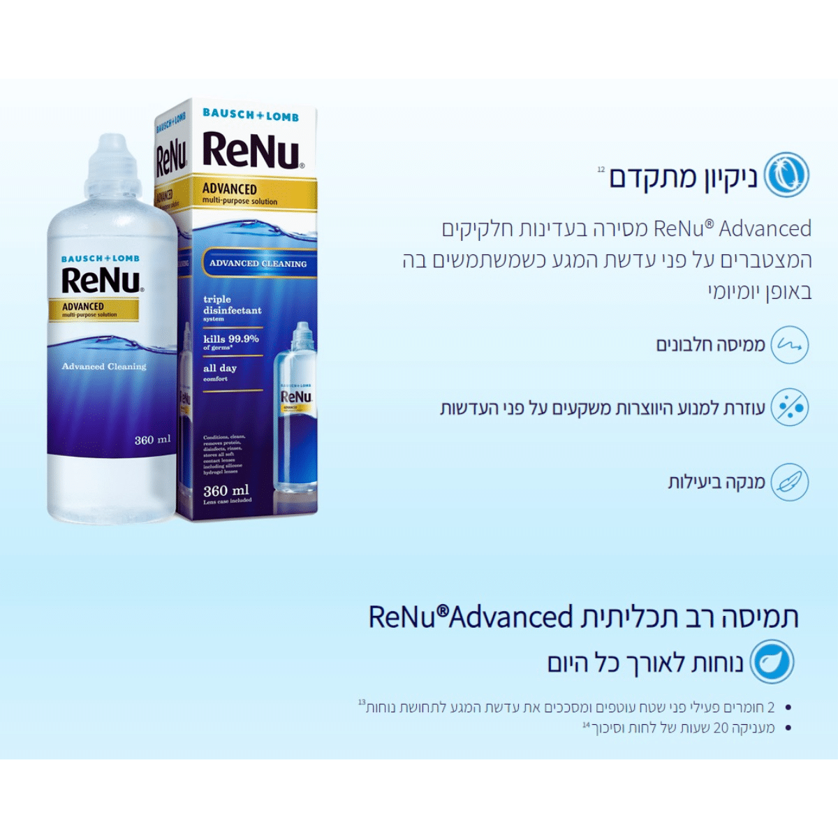תמיסת רניו אדוונס 360 מ"ל (ReNu Advanced 360ml) מבית Bausch & Lomb, הינה תמיסה רב תכליתית מתקדמת המיועדת לכול סוגי עדשות המגע הרכות כולל לעדשות סיליקון הידרוג'ל. תמיסה זו משמשת באופן יום יומי לניקוי חיטוי, שטיפה, אחסון, והסרת חלבונים הכל באחת (all in one).