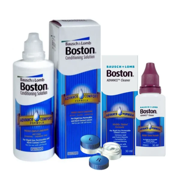 ערכת ניקוי בוסטון של חברת בוש אנד לאמב (Boston Kit) מכילה תמיסת ניקוי והשריה + סבון ניקוי לעדשות מגע קשות נושמות חדירות חמצן. (1) Boston Advance Cleaner 30ml הינו סבון, לחיטוי, ניקוי והסרת שומנים, של עדשות מגע קשות חדירות חמצן. המוצר מונע הצטברות משקעים ולכלוך על גבי העדשה. המוצר מסייע למנוע תחושת אי נוחות הנגרמת עקב הרכבת עדשות המגע ומסייע למנוע מצבים של דלקת בעין.
